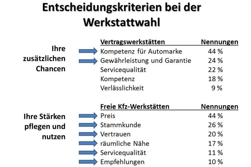 Kriterien Werkstattwahl neuJe nachdem welche Studie oder Befragung man bemüht… mal fallen die Ergebnisse so aus, mal so. Relativ deckungsgleich sind die Resultate jedoch bei der Fragestellung, warum Kunden die Vertragswerkstätten aufsuchen und wann diese freie Kfz-Werkstätten bevorzugen. Beschäftigt man sich dann mit den Gründen der beiden Kundengruppen, so lässt sich damit eine strategische Ausrichtung für freie Kfz-Unternehmer begründen.