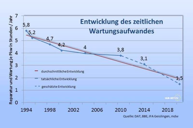 Bild: IAM-NET.EUDie Wartungs- und Reparaturaufwendungen für Neufahrzeuge haben sich in den letzten Jahren schrittweise deutlich reduziert. Lag der Wartungsaufwand im Jahr 1980 für ein Fahrzeug noch bei rund 7 Stunden pro Jahr, so liegt diese bei Fahrzeugen der aktuellen Generation bei circa 4 Stunden.